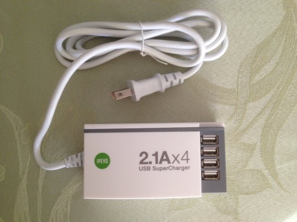 We’re a household with several Apple mobile devices. We use a charging station in a corner of our kitchen counter to keep our iPhone and iPad batteries charged and ready to go. My setup is simple. I used an old folder holder or desk organizer for the devices. Any of our iPads will fit in a slot, even with a folio cover. Power is supplied by an IPEVO USB SuperCharger that can charge up to four devices simultaneously. Mine is an older model in white. USB chargers are also available from other companies. You’ll need to supply your own cables.